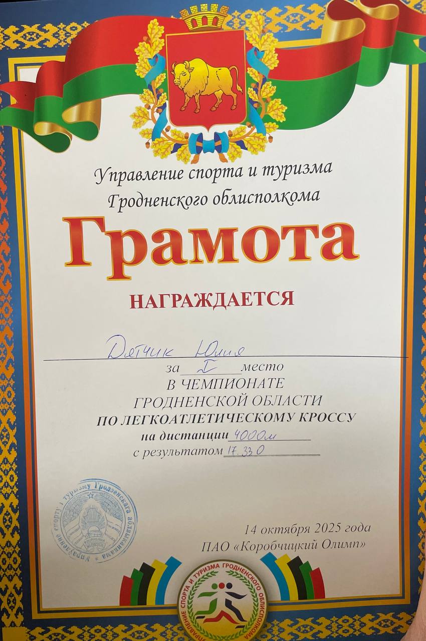 Адвокат юридической консультации Октябрьского района г.Ггродно, медиатор, член совета молодых адвокатов областной коллегии Юлия Дятчик стала абсолютным победителем на дистанции в 4000 метров среди участниц 2005 года рождения и старше.