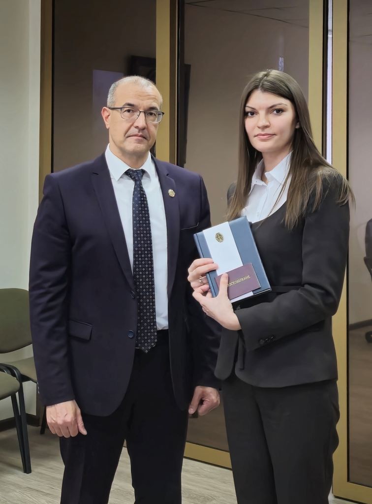 Поздравляя Викторию Николаевну со вступлением в состав областной коллегии адвокатов, Вадим Валерьевич вручил ей удостоверение и значок адвоката, а также ежедневник для планирования работы с пожеланием профессиональных успехов.