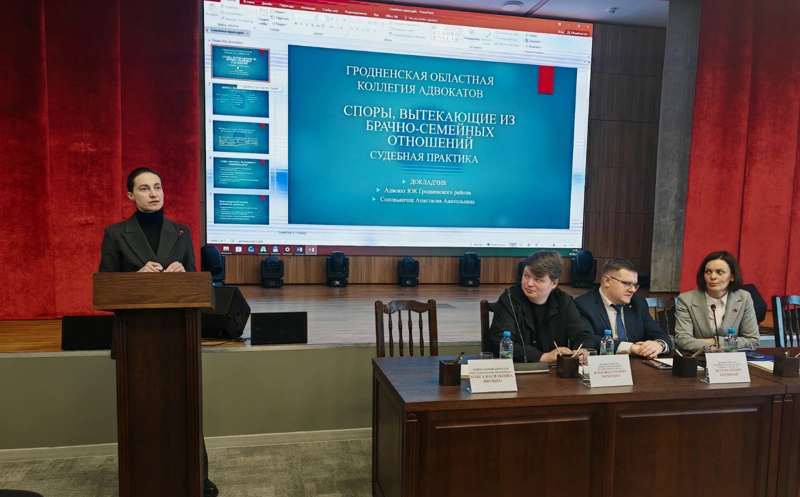 Анастасия Анатольевна, используя презентационный материал, осветила тему «Участие адвоката в судебных спорах, связанных с расторжение брака, разделом имущества, являющегося общей совместной собственностью супругов, а также спорах о воспитании детей».