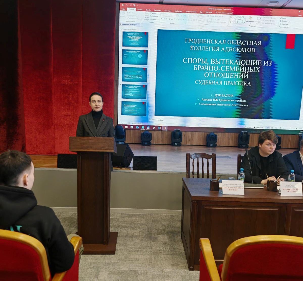 Адвокат рассказала о важности сохранения семьи. Обратила особое внимание на то, что при рассмотрении дел данной категории суды принимают меры, направленные на примирение супругов и сохранение семьи, обеспечение защиты прав и законных интересов несовершеннолетних детей, а также вытекающих из брачных и семейных отношений имущественных и личных неимущественных прав супругов, других членов семьи. Также разъяснила порядок оказания и виды юридической помощи, оказываемой адвокатом.